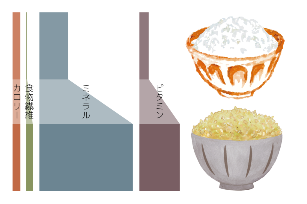 食感や食味、消化に大きく影響する糠や胚芽を取り除くことで、炊飯がかんたんで、食感がよく、美味しく、消化もよくなった白米ですが、取り除かれた糠や胚芽にはたくさんのビタミン、ミネラル、食物繊維が含まれています。